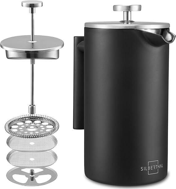 La SILBERTHAL es una cafetera francesa de 1 litro fabricada en acero inoxidable de doble pared, ideal para preparar hasta 8 tazas de café filtrado con cuerpo, aroma y sin residuos. Su diseño elegante, resistente y térmicamente aislado la convierte en una opción premium para amantes del café manual. Sin cápsulas ni electricidad, perfecta para el día a día, oficinas o exteriores.